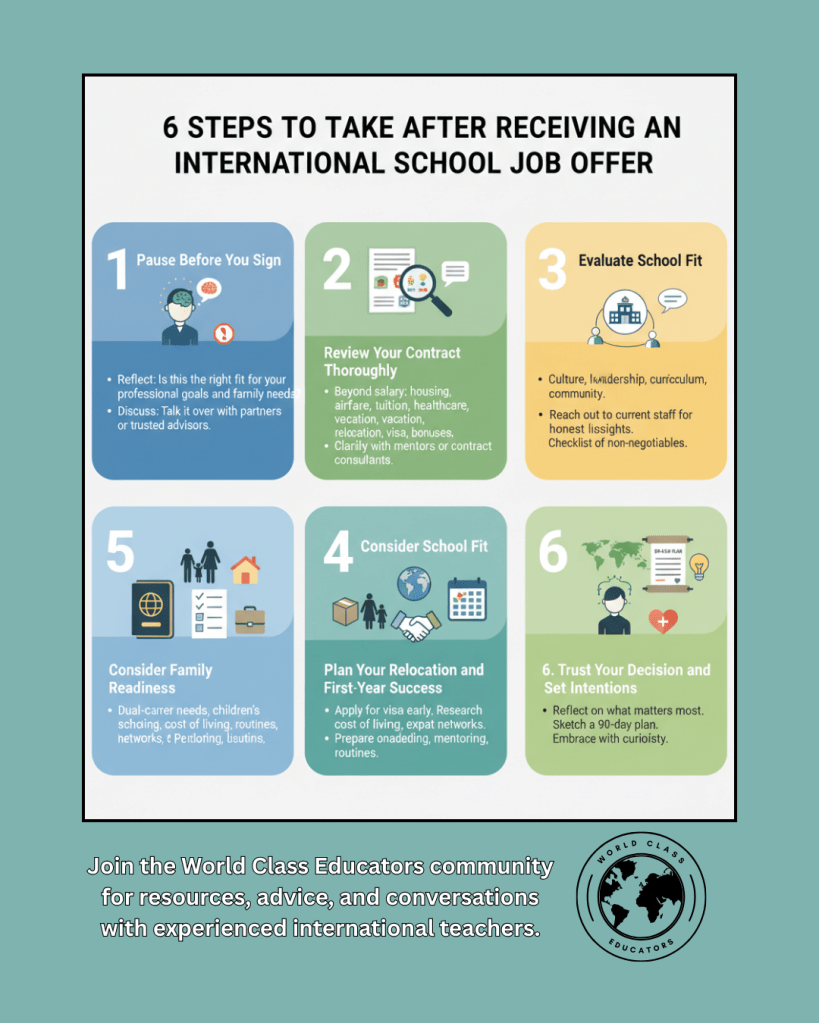 After navigating this process multiple times as an international educator, I’ve learned that the steps you take right now matter more than people realize. A deliberate, thoughtful approach after receiving an international school job offer can prevent major stress later. In this post, I’m sharing what experienced teachers do before signing an international teaching contract, along with practical strategies for reviewing benefits, evaluating school fit, and planning your move abroad with confidence.